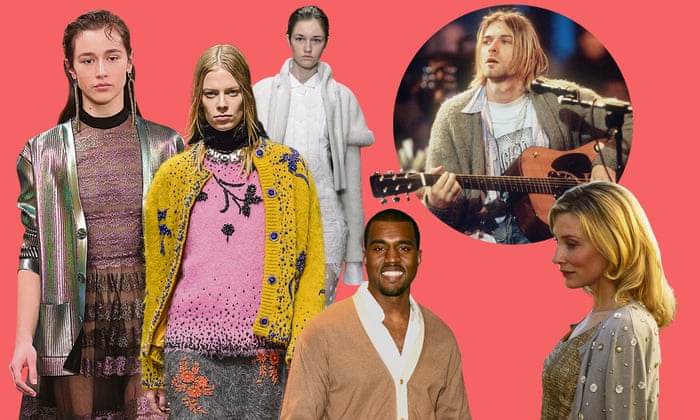Cardies on the catwalk at Christopher Kane, Prada and Burberry; Kanye West, Kurt Cobain and Cate Blanchett. Composite: Rex/Getty