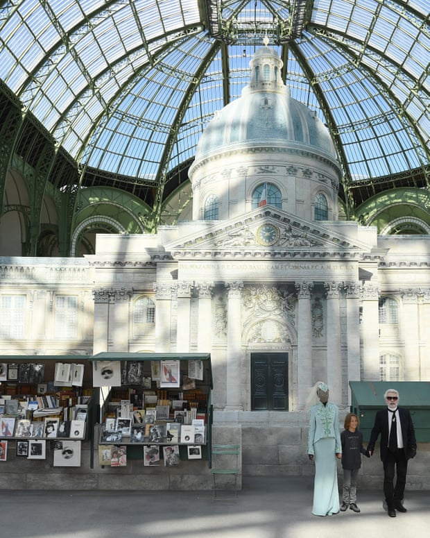 Chanel’s creative director, Karl Lagerfeld, was feeling bookish this season – or so implied the unmistakable Parisian book booths, usually found along the Seine, that he recreated for his autumn/winter 2018 couture show this afternoon. It was the latest chapter in the great Chanel set story, which has seen the brand’s regular Grand Palais location transformed into a casino, supermarket and a space station. Lagerfeld was joined to take his bow with model of the moment, Adut Akech, who had the honour of being this season’s couture bride. Dressed in a mint suit, rather than the customary white, her ensemble took the audience by surprise. Read the reaction and show review here.