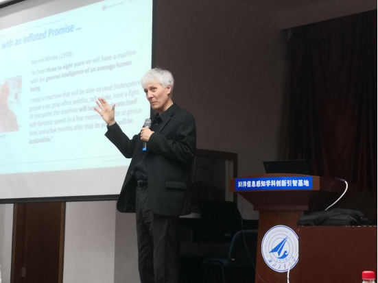 Knoll教授首先介绍了从显微镜到图灵等一系列人脑研究的科技里程碑事件。紧接着,作为HBP的SP10神经机器人平台负责人,Knoll教授详细介绍了该机器人平台的研发最新成果、相关实验影响资料、机械运行原理以及未来产业化方向等。同时,教授还介绍了运用嵌入式控制性闭环系统的神经机器人项目、类人机器人项目等。报告结束后,院长潘光代表澳门十大网投平台排行向Knoll教授赠送纪念品,共同探讨招收联合培养博士生和进一步开展科研合作等事宜。