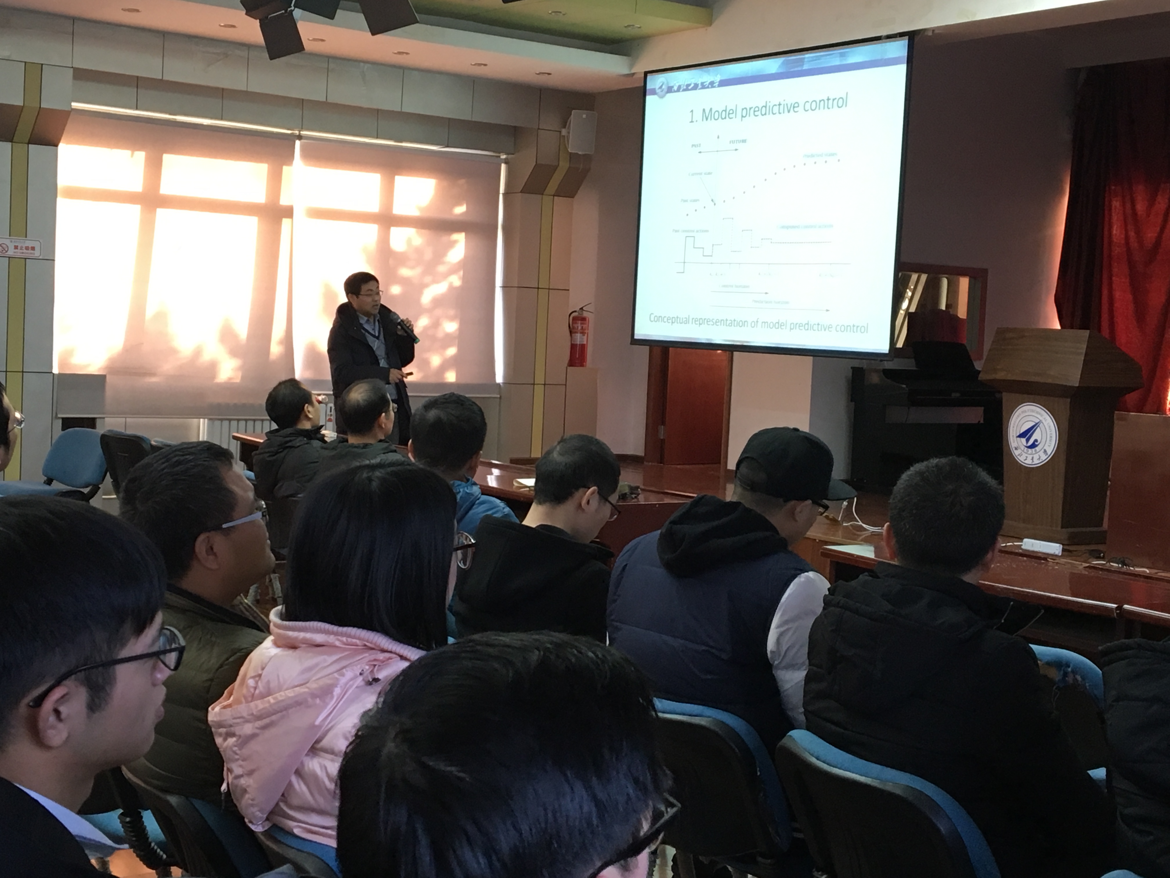 报告中,李乐老师首先介绍基于优化的模型预测控制理论方法,重点介绍基于串联和并联交互机制的分布式模型预测控制方法。之后,李乐老师结合具体“路-铁-水”多式联运系统调度管理应用实际,给出了多式联运系统建模及协同控制方法,此外还介绍在水下机器人协同控制方面的研究。报告结束后,部分教师与学生针对模型预测控制的相关问题进行发言和提问,李乐老师结合自己近年来的研究情况一一进行解答。