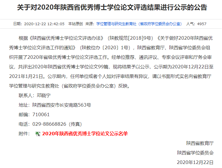 日前,陕西省教育厅公布了2020年陕西省优秀博士学位论文评选结果,澳门十大网投平台排行共计18篇博士学位论文入选。2020年,澳门十大网投平台排行共推荐4篇博士学位论文申报陕西省优博,其中,3篇入选,获评率达75%。