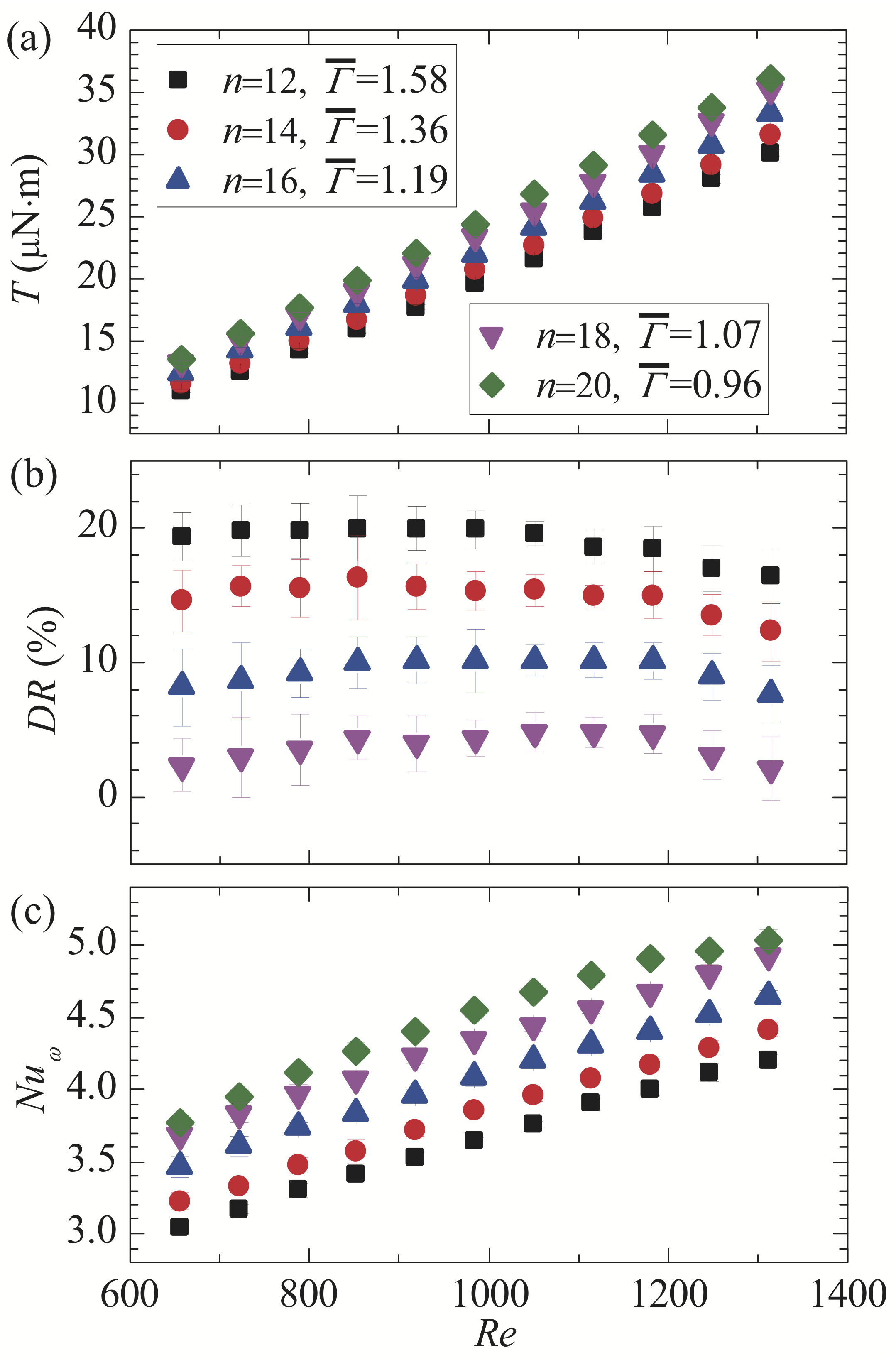 图2.不同涡结构状态下转子扭矩、减阻率和努塞尔数