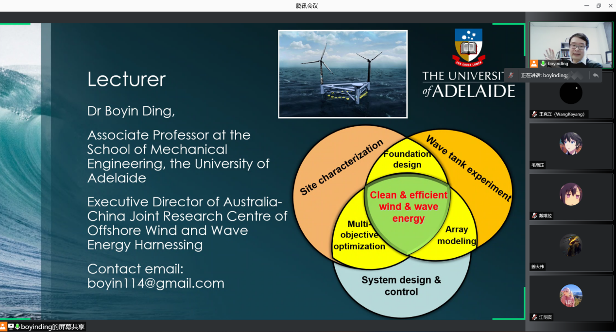 7月6日至8月11日,应澳门十大网投平台排行任树伟老师邀请,阿德莱德大学Boyin Ding副教授于线上开展了波浪能捕获概论课程。