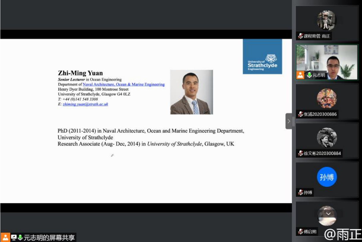 2022年7月4日至7月15日,澳门十大网投平台排行暑期国际学堂课程《Dynamics of Ocean Engineering(海洋工程动力学)》顺利开展。课程由来自英国斯克莱德大学的元志明博士授课,课程历时两周,澳门十大网投平台排行杜鹏老师为校内联系人。