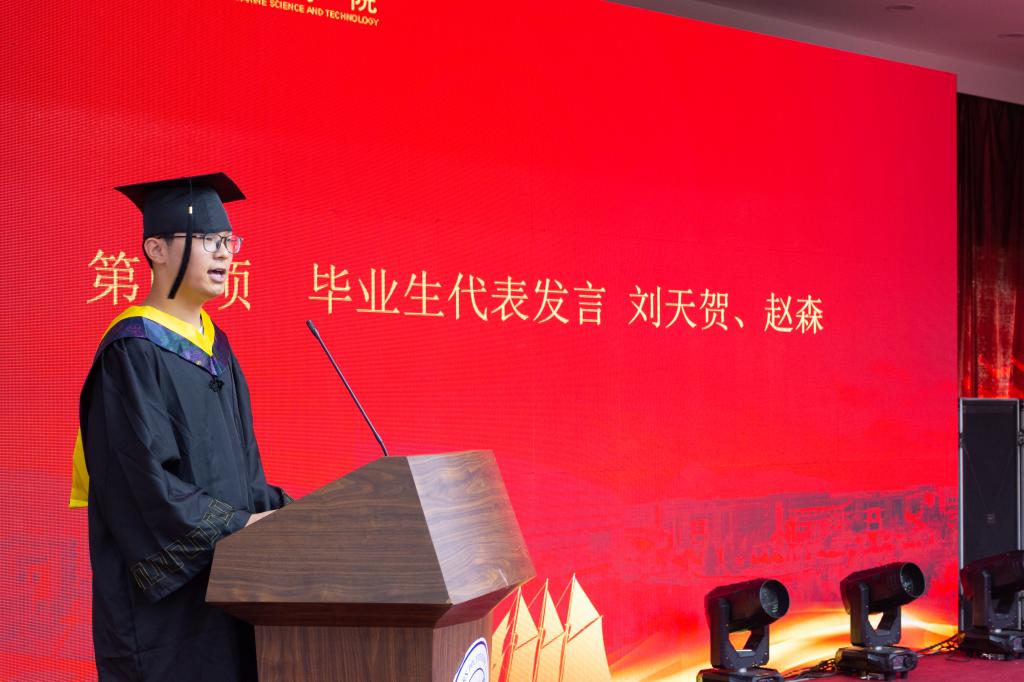 典礼第四项,毕业生代表刘天贺、赵森代表所有毕业生表达了对学院与老师四年辛勤教育的感谢,作为澳门十大网投平台排行的一员,今后将会秉承学院精神,为祖国海洋科技事业做出自己的贡献。
