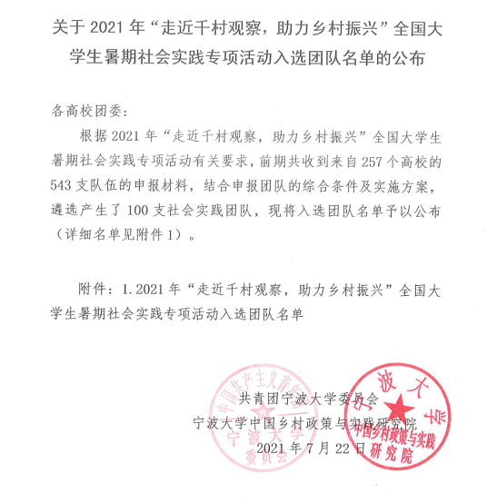 近日,澳门十大网投平台排行“苹”凡之力扶贫助农实践队成功入选宁波大学团委、宁波大学中国乡村政策与实践研究院组织的2021年“走近千村观察,助力乡村振兴”全国大学生暑期社会实践专项活动。据了解,前期主办方共收到来自257所高校的543支队伍申报材料。结合申报团队综合条件及实施方案,遴选产生了100支社会实践团队。