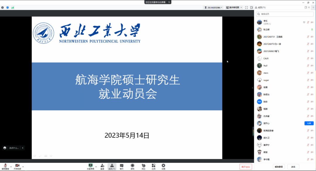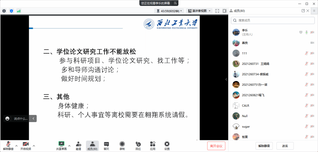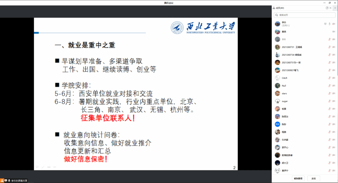 随后,李乐与赖慧向大家介绍了学院在毕业生就业方面的一些计划与安排,特别是即将开展的就业实践队,希望有就业意向的同学积极报名单位联系人,在加强自己与意向单位沟通的同时为同学们服务。李乐强调就业是重中之重,应当早谋划早准备,多渠道准备与争取,尽可能为自己找到一份称心如意的工作。作为年级辅导员,李乐还就学习、健康以及年级日常管理对大家提出了一些要求与建议:一方面不能放松自己的学位论文研究工作,在同时参与科研项目、学位论文研究、找工作时,要做好时间规划,多和导师沟通讨论;另一方面近期有部分同学出现复阳的情况,希望大家注意身体健康,做好个人防护。