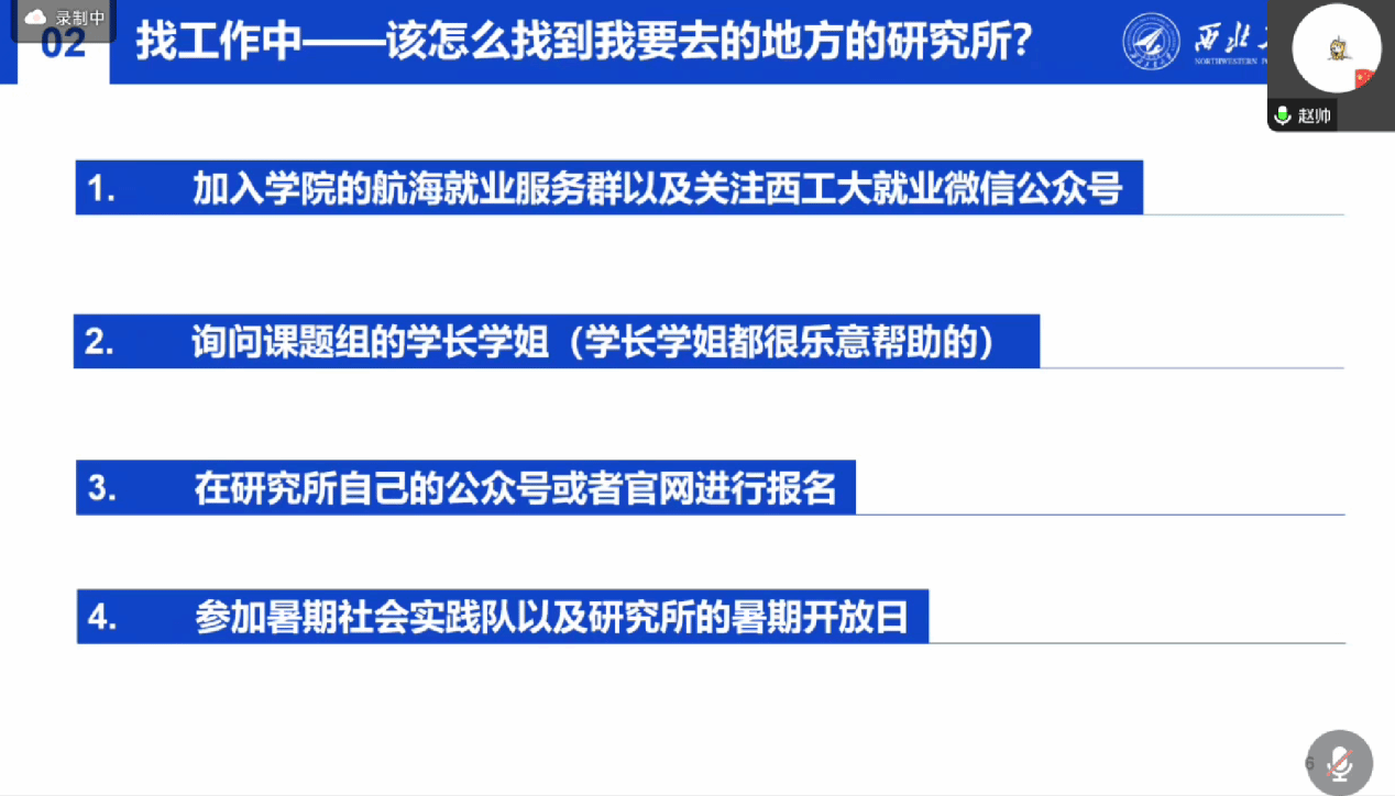 赵帅学长指出,求职前期要从就业地点、薪资水平和科研方向三个维度,明确自身就业选择;通过加入学院就业服务群,关注西工大就业微信公众号、企业公众号进行报名,参加暑期社会实践及研究所暑期开放日等多个途径去寻找就业企业;求职后期要妥善应对无意向招聘企业和硕士毕业答辩。他建议,充分利用课题组资源,多参加项目来丰富自身经历。