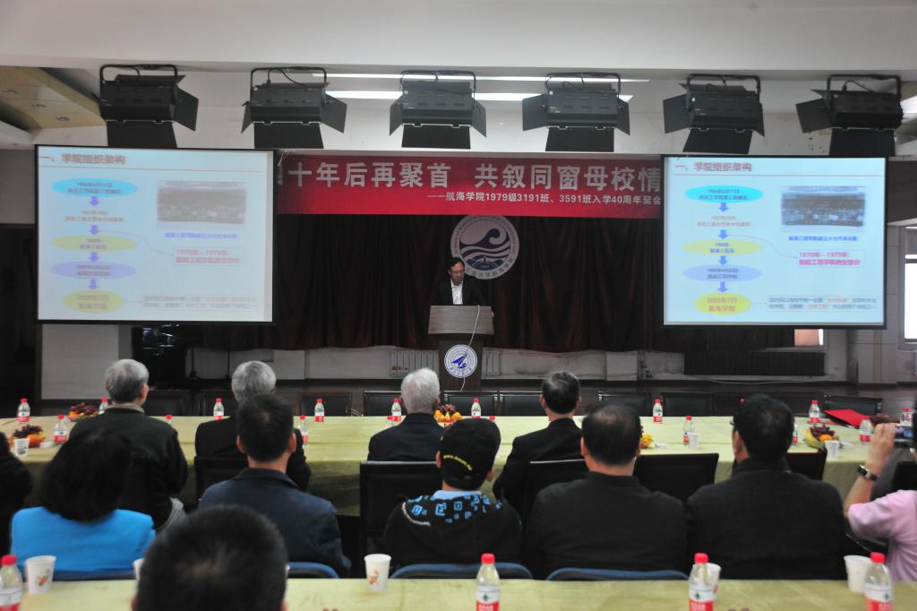 杰出校友代表段桂林、李明向学院赠送书法匾额,其上写着“遥想当年四十棵新苗唤超水中兵器,园丁再创业;还看今日八一四迎送铸就航海工程,桃李遍五洲”,以表示同学们对学院的关怀教育之恩的深深感谢。现场氛围一片高涨,校友们对学院和老师的栽培之恩的感激溢于言表。