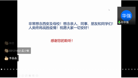 马晓川研究员图文结合,以史实为证,生动讲解了海洋国防安全对中华民族伟大复兴的重要意义,启示与会师生关心海洋、认识海洋、经略海洋。会议结束之际,马研究员深情地说:“非常想念西安及母校!想念亲人、同事、朋友和同学们!人类终将战胜疫情!祝愿大家一切都好!”