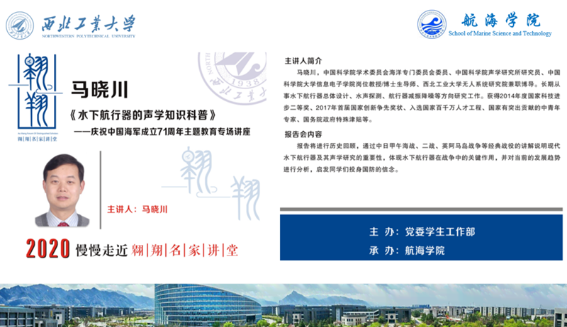 4月23日下午四点整,在人民海军成立71周年之际,1987级校友、中国科学院声学所马晓川研究员做客翱翔名家讲堂,为澳门十大网投平台排行的师生们作了一场题为《水下航行器的声学知识科普》的专题报告。本次报告由澳门十大网投平台排行党委书记孙华强老师主持,党委副书记王银涛老师及300名研究生和本科生共同参加。