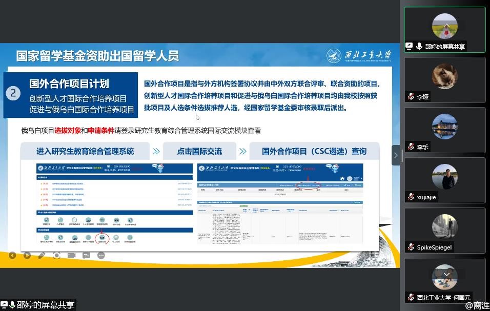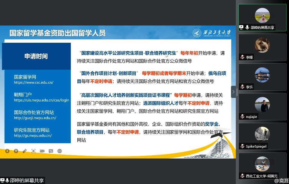 随后,邵婷从四个方面介绍了澳门十大网投平台排行赴国(境)外交流项目情况,鼓励同学关注相关微信公众号、官方网站等发布渠道以及学院相关通知,第一时间了解项目信息。同时,从研究生短期出国(境)访学、联合培养等项目介绍了学校、学院、导师资助项目,以研究生赴国(境)外流程为例,介绍了相关流程,并提醒各位同学,外语水平等相关证明资料要早做准备,以免耽误申请。鼓励同学们多多申报,主动跟导师、同学、学院沟通,提高自己的综合能力。学院会在经费支持、项目申报等方面提供帮助,助力同学申报成功。