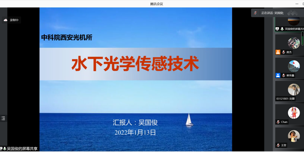 停工不停教,停课不停学,疫情防控期间为了有针对性地开展研究生教育工作,丰富学生校园生活和学习,1月13日10:00,澳门十大网投平台排行成功举办“翱翔灵犀学术殿堂”第697期线上讲堂。本次活动由党委学生工作部主办,澳门十大网投平台排行承办,特邀西安光机所海洋光学技术研究室主吴国俊研究员开展专题讲座,由澳门十大网投平台排行副院长崔荣鑫教授主持,学院150余名师生参加讲座。